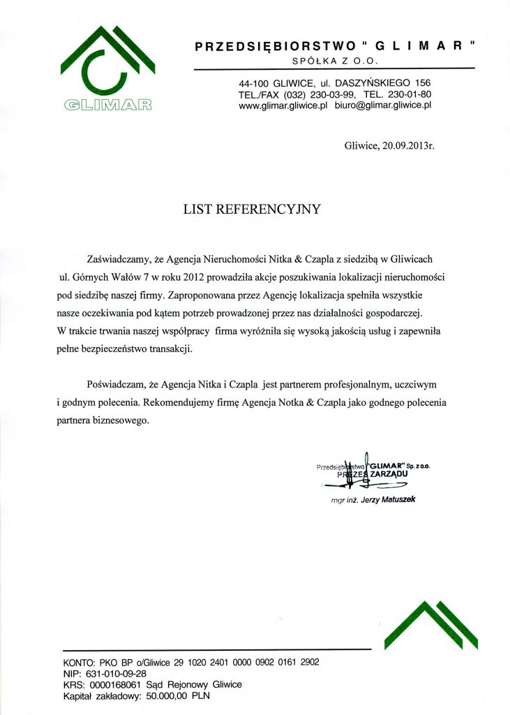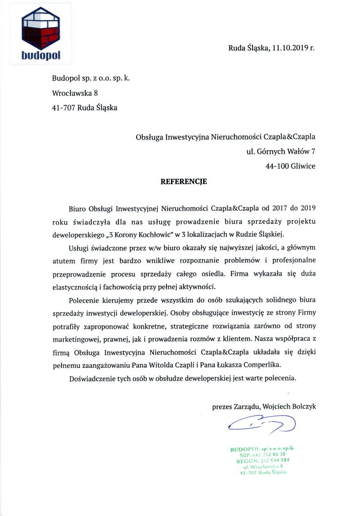 "Pani Irena Gintowt jest zatrudniona w firmie Czapla&Czapla w Gliwicach. Pani Irena na swoim stanowisku wyróżnia się dużą wiedzą i operatywnością. Znajomość dokumentów, umów - to ogromna wiedza na każdy temat. Ja z siostrami bardzo dziękujemy Pani Irenie za sprawnie przebiegającą transakcję, mimo trudnej sytuacji na rynku nieruchomości. Pani Irena to osoba kompetentna, dba o interesy strony sprzedającej i kupującej. Zawsze miła, serdeczna. Rozmowy telefoniczne również poza godzinami pracy - jeśli jest taka potrzeba. Większość spraw była załatwiana przez Panią Irenę (pośrednictwo przy aktach notarialnych, pismach, wypełnianie dokumentów do różnych instytucji). Czułyśmy się bardzo bezpieczne, aż do momentu przekazania kluczy nowym lokatorom. Najlepszy pracownik sprzedaży nieruchomości. Firma może być dumna z takiego pracownika. Polecam. Krystyna Kamińska."