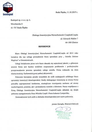 "Przekazujemy nasze serdeczne wyrazy wdzięczności wraz z podziękowaniem dla Pana Czapli za udzielenie nam polecenia osoby Pani Ireny G. Jesteśmy jej wdzięczni za miłą, profesionalną, jednocześnie kompetentną obsługę, związaną z przygotowaniem przez nią wszystkich formalności dotyczących doprowadzenia naszej nieruchomości do finalnego końca jej sprzedaży. Należy podkreślić to, że zawsze była osiągalna, posiadała nie tylko czas, ale i cierpliwość, wysoką kulture osobistą, stale odczuwalne przez nas dobre nastawienie dla sprawy oraz dla nas, a przede wszystkim odczuwalną empatię. Dzięki jej osobistemu zaangażowaniu w wykonywaną pracę była odczuwalna zarówno jej efektywność jak i terminowość. Dziękujemy za umożliwienie dokonania zarówno sprawnie jak i bezproblemowo przebiegającego Notarialnego terminu sprzedaży tej nieruchomości. Nieruchomości posiadającej bardzo skomplikowaną w Księdze Wieczystej przeszłość!!! Polecamy osobom zainteresowanym korzystania z usług biura Czapla&Czapla."