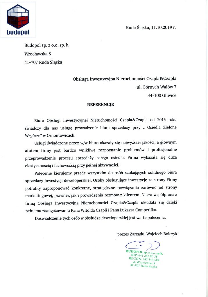 "Z czystym sumieniem i z całego serca polecamy firmę Czapla&Czapla, a w szczególności Panią Irenę Gintowt, która przeprowadziła nas przez długi, ale bardzo korzystny zakup nieruchomości. Pani Irena jest definicją odpowiedniej osoby na odpowiednim stanowisku, udowodniła nam, że inwestor to nie tylko zarobek, ale człowiek potrzebujący pomocy, której udzieliła nam na 200%. Pani Irena zna się na każdym aspekcie prawno-administracyjnym, rzetelnie wykonuje swoje zadania, mówiła co i jak mamy zrobić. Dla Pani Ireny nie ma granic, nie da się drzwiami? Pani Irena wraca oknem ;). Jeszcze raz dziękujemy za profesjonalną pomoc i przeprowadzenie nas przez zakup nieruchomości, zyskała Pani nasze pełne zaufanie. jeżeli w przyszłości będzie okazja, na pewno skorzystamy z usług biura Czapla&Czapla z pomocą Pani Ireny ;)"