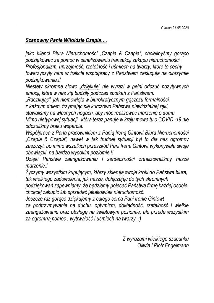 "Parę dni temu za pośrednictwem Agencji Nieruchomości Czapla&Czapla w Gliwicach szukaliśmy z żoną mieszkania. W nasze poszukiwania bardzo zaangażowała się Pani Irena Gintowt. W przeciągu krótkiego czasu pokazała nam kilka mieszkań, które w Jej przekonaniu mogłyby spełniać nasze oczekiwania. Szczęśliwie udało się!!! Chcieliśmy Jej bardzo za to podziękować. Dzięki Niej znaleźliśmy z żoną dokładnie takie mieszkanie, jakie nam było potrzebne. W bardzo krótkim czasie umówiła nas na spotkanie z właścicielem i przygotowała wszystkie potrzebne do notariusza dokumenty. Do końca nadzorowała proces sprzedaży, finalizując całą transakcję. Wszystko sprowadzało się już tylko do podpisania dokumentów. Pani Ireno bardzo Pani dziękujemy. Chcemy również podziękować całej Agencji Czapla&Czapla, wszystkim pracownikom, dzięki którym cała transakcja poszła tak sprawnie i szybko. Załatwianie interesów w Waszej agencji to czysta przyjemność. Raz jeszcze Wszystkim dziękujemy. "
