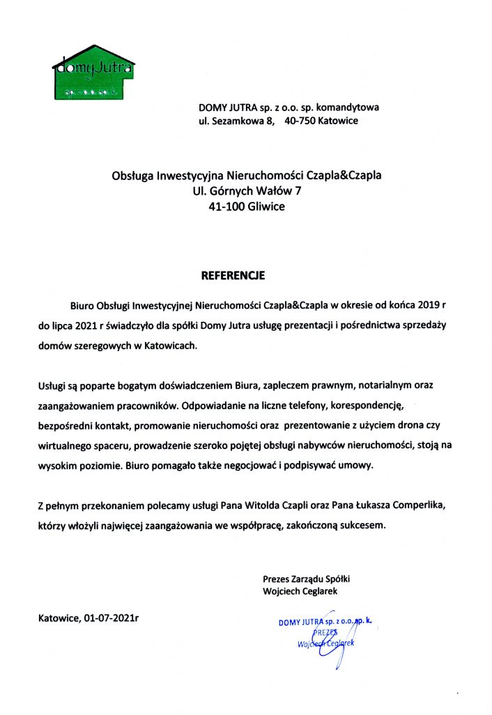 "Witam serdecznie. Wystawiając opinie dla biura nieruchomości Czapla & Czapla chcielibyśmy podziękować zespołowi: Pani Irenie Gintowt, Pani Soni Kuźniak oraz właścicielowi Panu Witoldowi Czapli za wspaniałą współpracę. Wykazując się bardzo dużym profesjonalizmem w prowadzeniu trudnej, wiązanej sprzedaży mieszkań w Krakowie i Gliwicach. Transakcja przebiegła pomyślnie i umożliwiła spełnienie naszego marzenia o posiadaniu własnego domu. Jeszcze raz dziękujemy za zaangażowanie i cierpliwość. Z całego serca polecamy agencję Czapla & Czapla. "